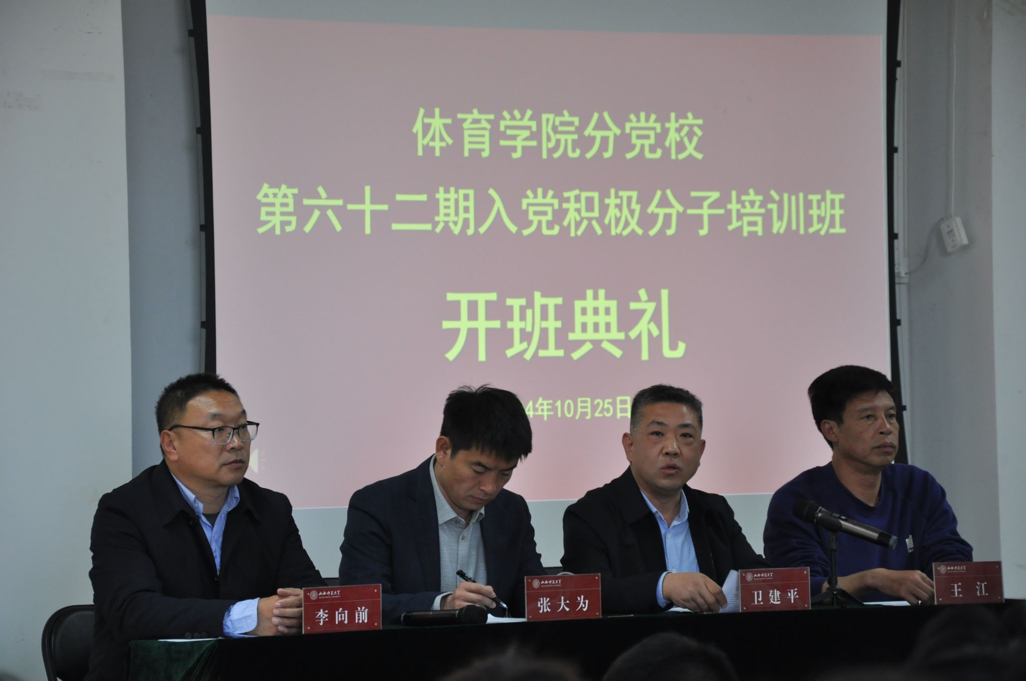 10月25日-10月31日,必赢76net线路举办了第62期入党积极分子培训班。25日中午,培训班开班典礼在7号教学楼运动心理实验室举行。院党委书记、分党校校长卫建平,院党委副书记张大为,院党委委员,副院长王江、李向前,院党委委员、体育教育系党支部书记张杰,社会体育系党支部书记李俊明,民族传统体育系党支部书记权黎明,研究生第一党支部书记王丽娜,体育教育系学生党支部书记高士惠,机关党支部书记温志静,团委负责人白翊辰及143名入党积极分子参加了开班典礼,开班典礼由张大为主持。