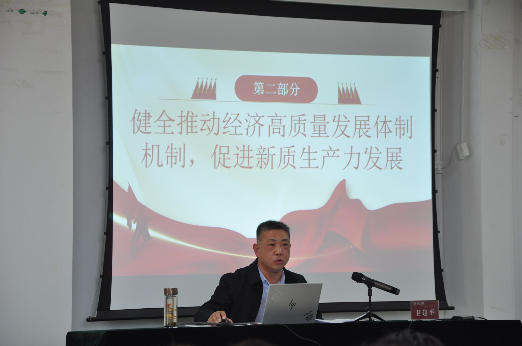 开班典礼结束后,卫建平为学员们讲授了第一讲《深入学习党的二十届三中全会精神》。他从把构建高水平社会主义市场经济体制摆在突出位置、健全推动经济高质量发展体制机制,促进新质生产力发展、构建支持全面创新体制机制、健全宏观经济治理体系、完善城乡融合发展体制机制、完善高水平对外开放体制机制、健全全过程人民民主制度体系、完善中国特色社会主义法治体系、深化文化体制机制改革、健全保障和改善民生制度体系、深化生态文明体制改革、推进国家安全体系和能力现代化、持续深化国防和军队改革、注重加强党对改革的领导等十四个方面,深入阐述了党的二十届三中全会精神。