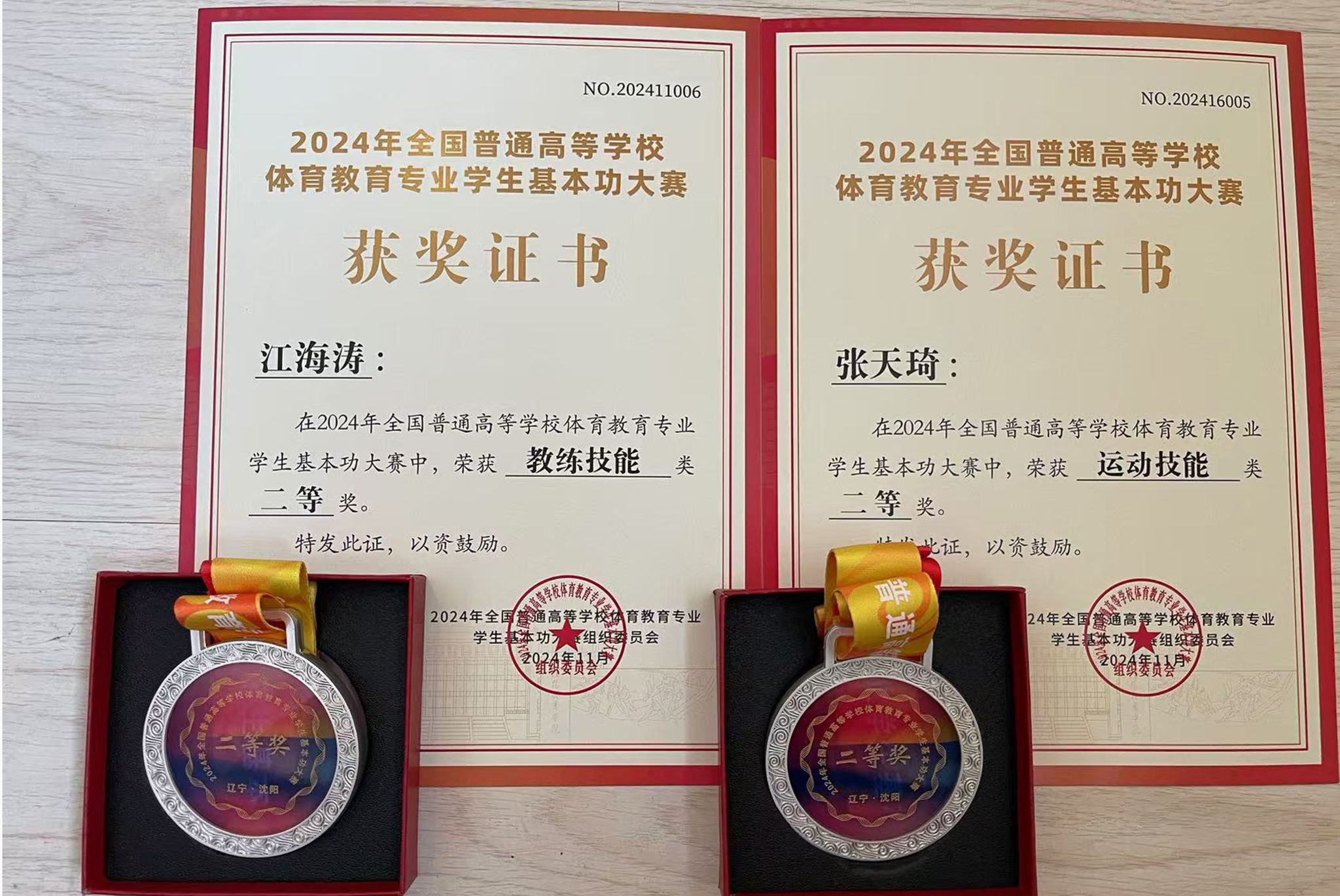 2024年11月11日——15日,必赢官网体育教育系学生参加了在沈阳必赢76net线路举行“全国普通高等学校体育教育专业学生基本功大赛”,此次比赛由教育部体育卫生与艺术教育司主办,辽宁省教育厅、沈阳必赢76net线路、全国高等学校体育教育教学指导委员会承办、中国教育科学研究院协办。此次比赛全国共有87所高校参加,348名运动员报名参赛。自10月接到山西省教育厅的比赛通知以来,院领导高度重视,积极动员,精心组织,由郭丽娟担任负责人,张杰担任领队,许登云、沈军担任教练,成立指导教师团队,分别对四名学生进行《体育概论》《运动解剖学》《运动生理学》《体育心理学》《健康教育学》理论知识学习、广播操培训,足球、篮球、排球以及田径等的运动技能训练、教学技能设计以及教练技能培训,经过艰苦训练、考核和参赛,最终,必赢官网体育教育系2021级学生江海涛荣获教练员技能类二等奖,张天琦荣获运动技能类二等奖。