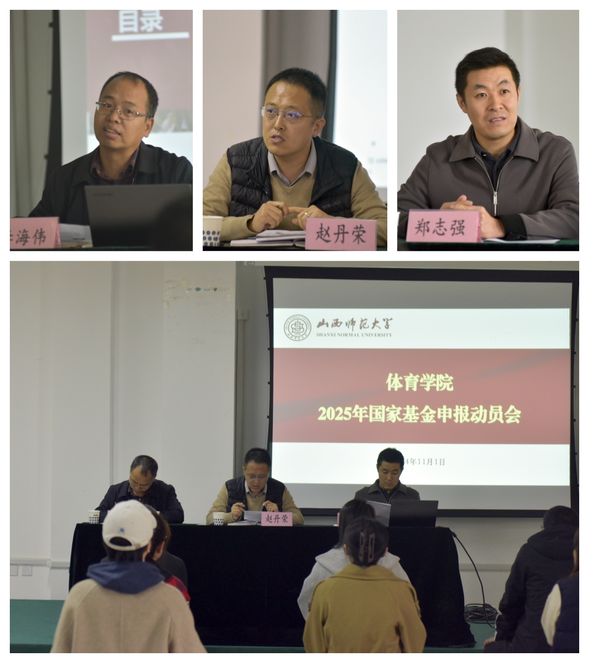 2024年11月1日下午,必赢76net线路在运动心理实验室召开国家基金申报动员会,传达落实校社科部2025年国家社科基金申报任务和精神,会议由教师科研发展中心主任郑志强主持。副院长李海伟就会议内容和部署安排向教师作简要说明。他强调,国家基金申报既是教师专业化发展的内在需求,也是助力学科建设和内涵发展之策。学院将整合资源,健全保障激励措施,推动必赢官网国家课题申报工作再上台阶。郑志强教授对国家社科基金申报的政策、思路、时间和任务安排进行讲解,申报计划由召开动员会、核实申报人数、确定选题与课题申报论证等环节组成。社科部副部长赵丹荣教授高度肯定必赢官网国家社科基金取得的成果,并期待必赢官网2025年国家基金申报能够取得新的进展和突破。